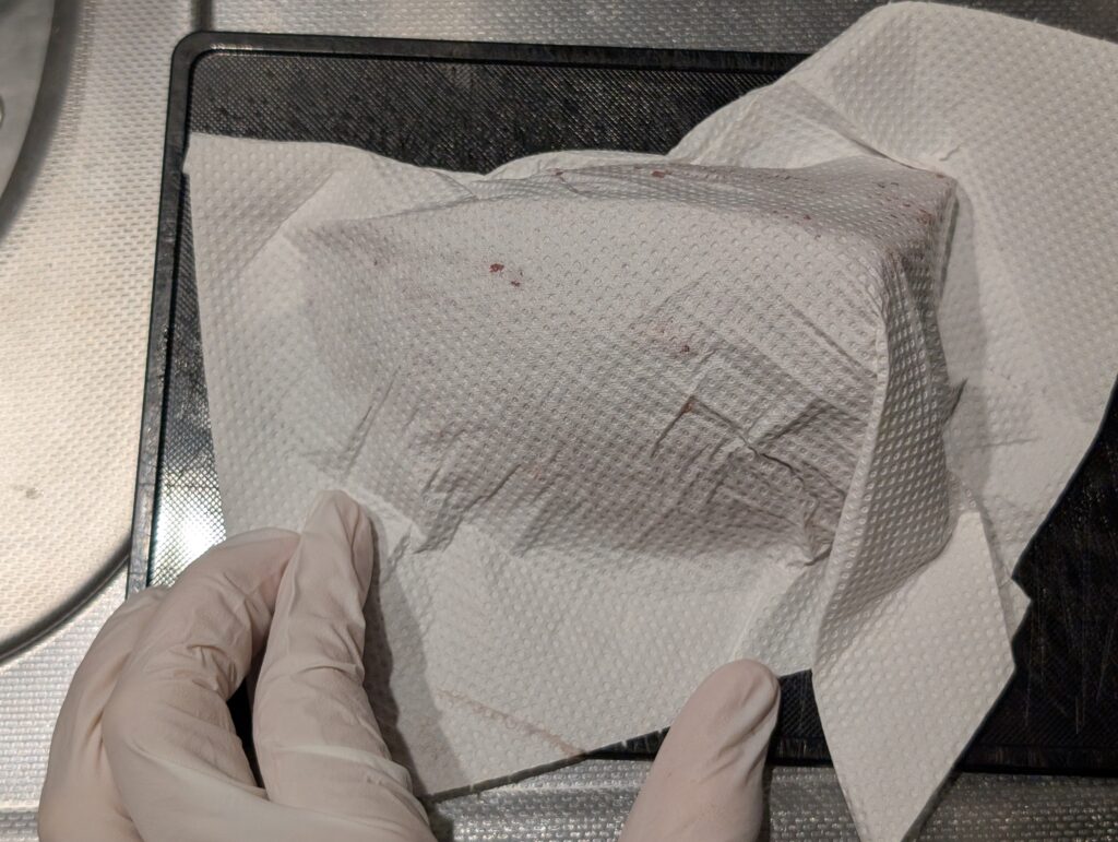 - キッチンペーパーで、肉の表面の水分を拭き取る